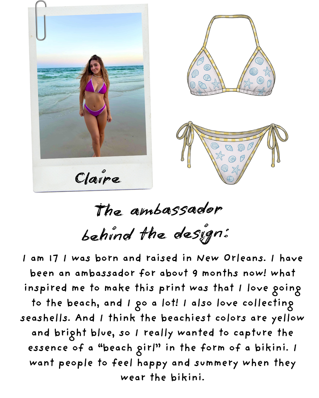 Introducing the Claire Top, crafted by our ambassador Claire! This swim essential features adjustable neck and back ties so you can dial in the perfect fit, plus removable pads for versatility. The standout hand-drawn shell print brings artisanal charm, while our signature palm tree charm adds that tropical touch we're known for. Comfort meets style in every wear.