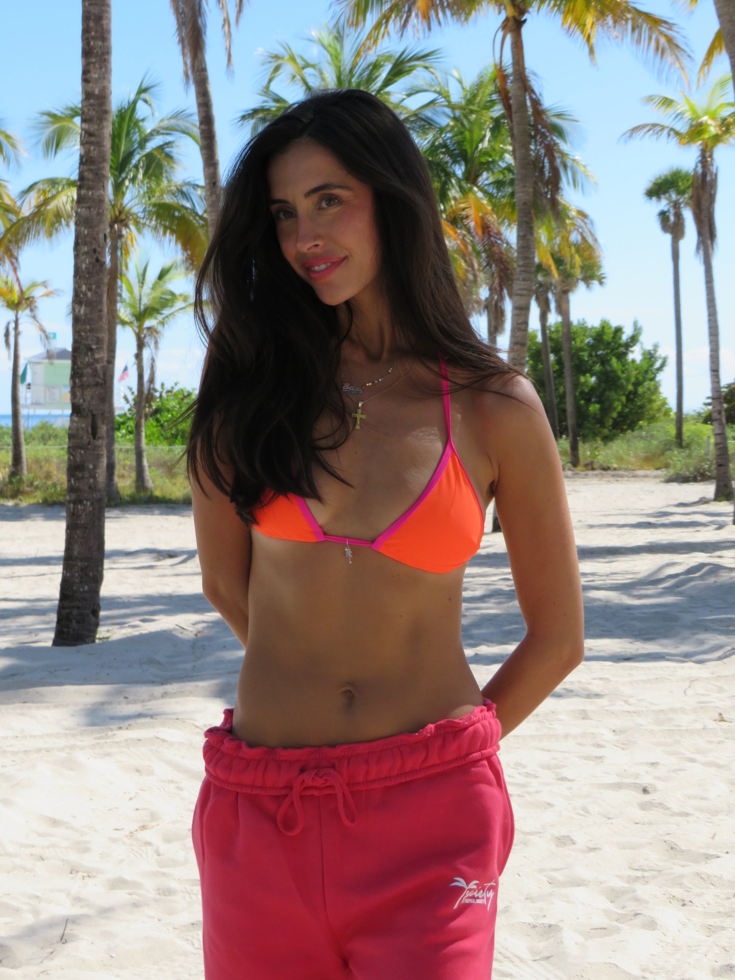Designed by our ambassador Anniston, this vibrant triangle top brings tropical energy with its bold orange and pink colorway. Removable padding lets you customize your coverage, while adjustable tie straps at the neck and back ensure a perfect fit every time. Playful, flattering, and ready for your next beach moment.